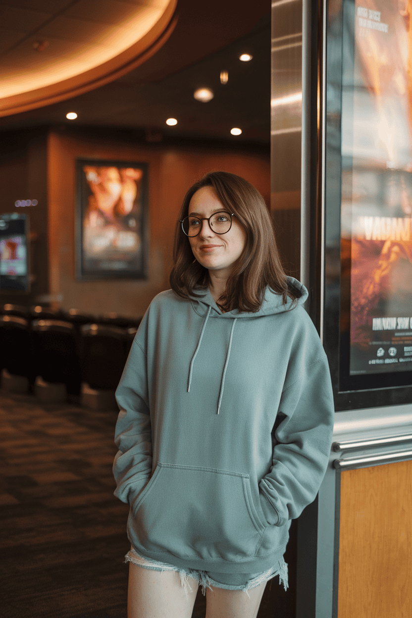 Go for a soft cotton hoodie and casual shorts if you want to keep it simple and comfy. This combo is perfect for a relaxed movie night.