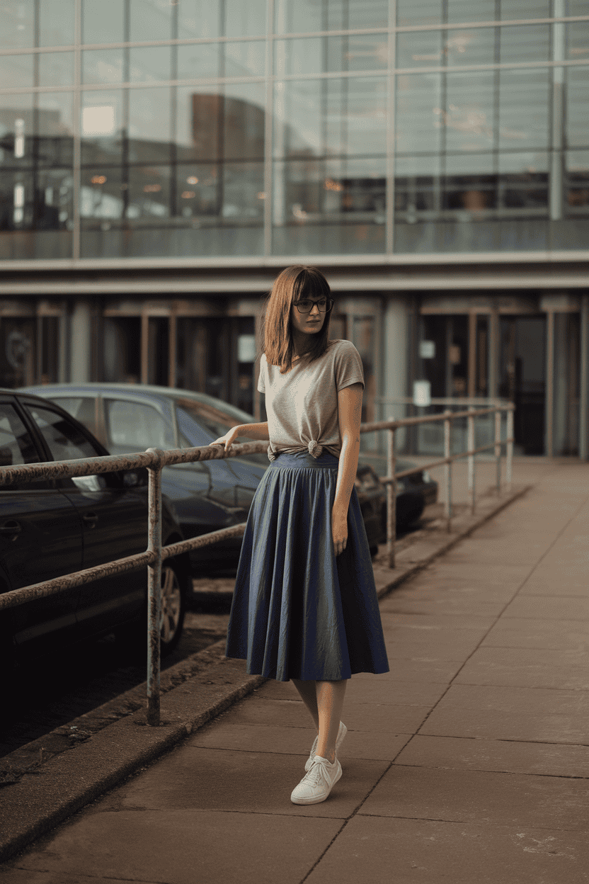 Midi skirt with a tucked-in tee shirt
