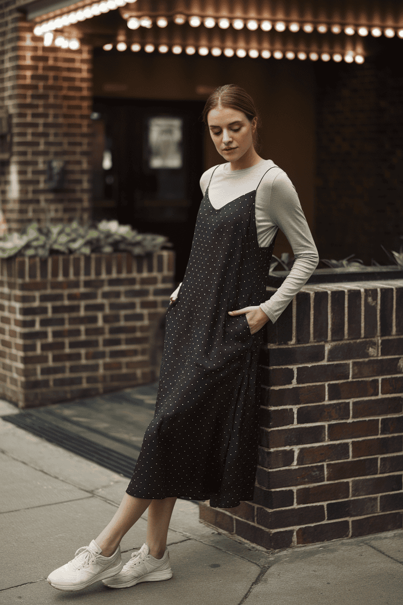 Layer a slip dress over a long sleeve tee for a laid-back vibe. White or black tees keep it classic and easy.