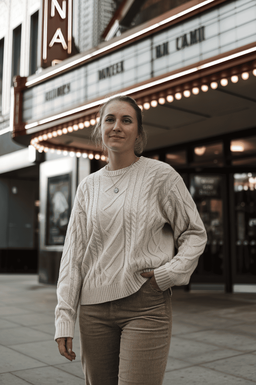 A cozy cable knit pullover just feels right for movie nights. It’s warm but not heavy, so you’re not sweating in the theater.