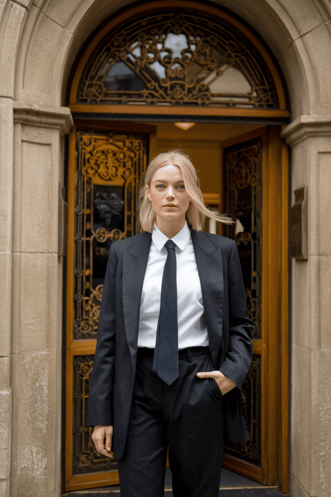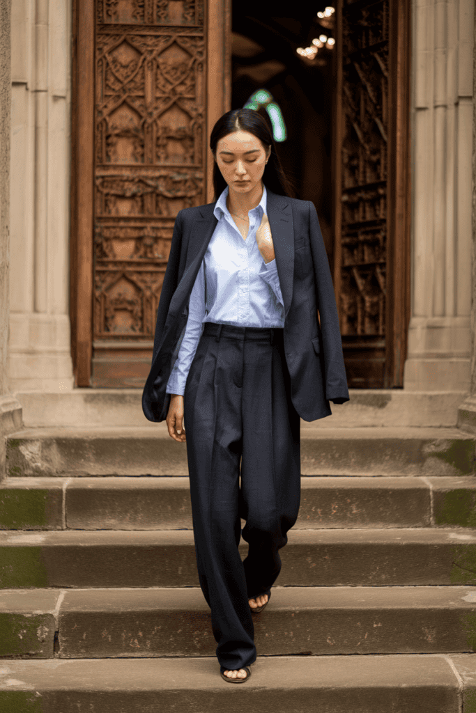 Dark tailored trousers with a crisp shirt.