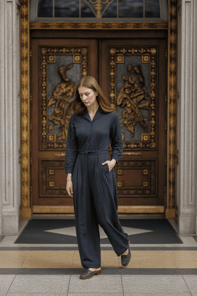 Tailored dark-colored jumpsuit.