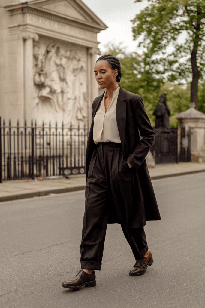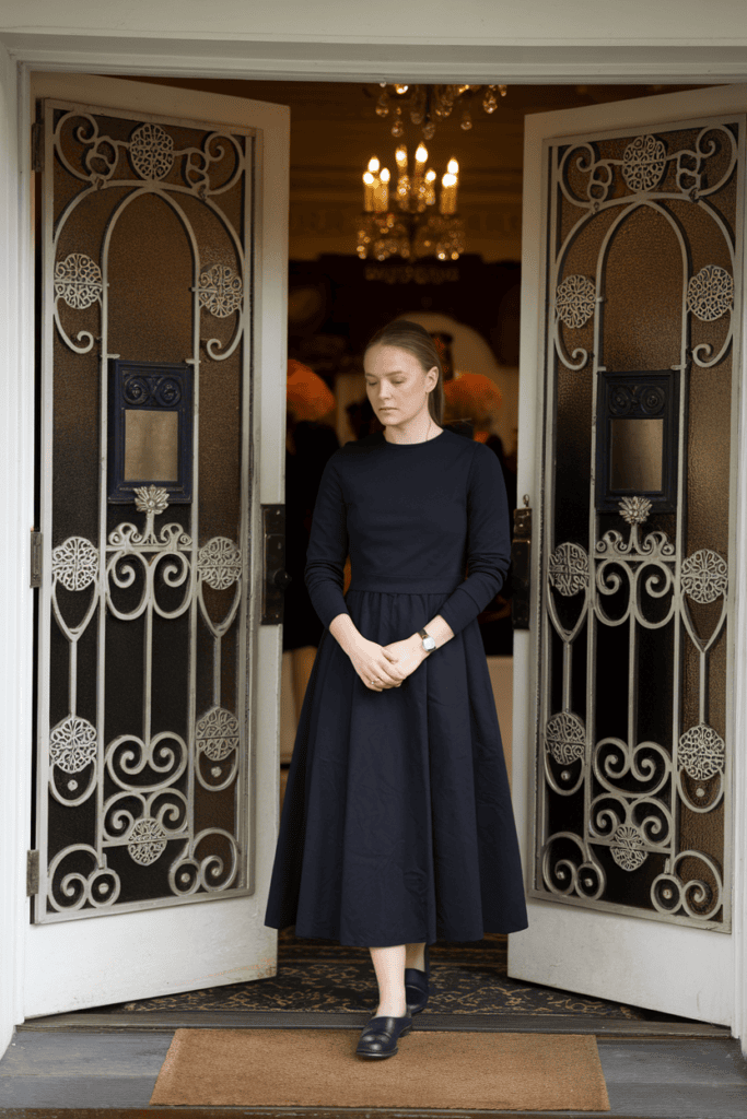 Stick to black or navy. Closed-toe shoes and subtle accessories round out the look without much fuss.