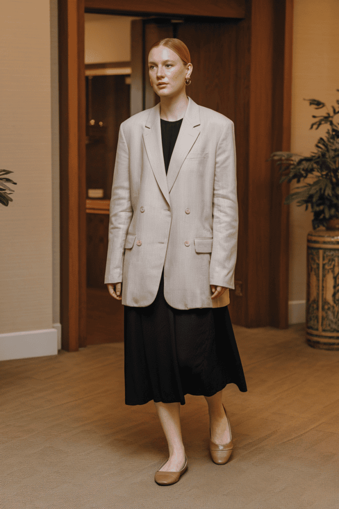 A neutral-toned cardigan or blazer adds a bit of formality without making you feel stiff. Beige, gray, or soft navy all work well.