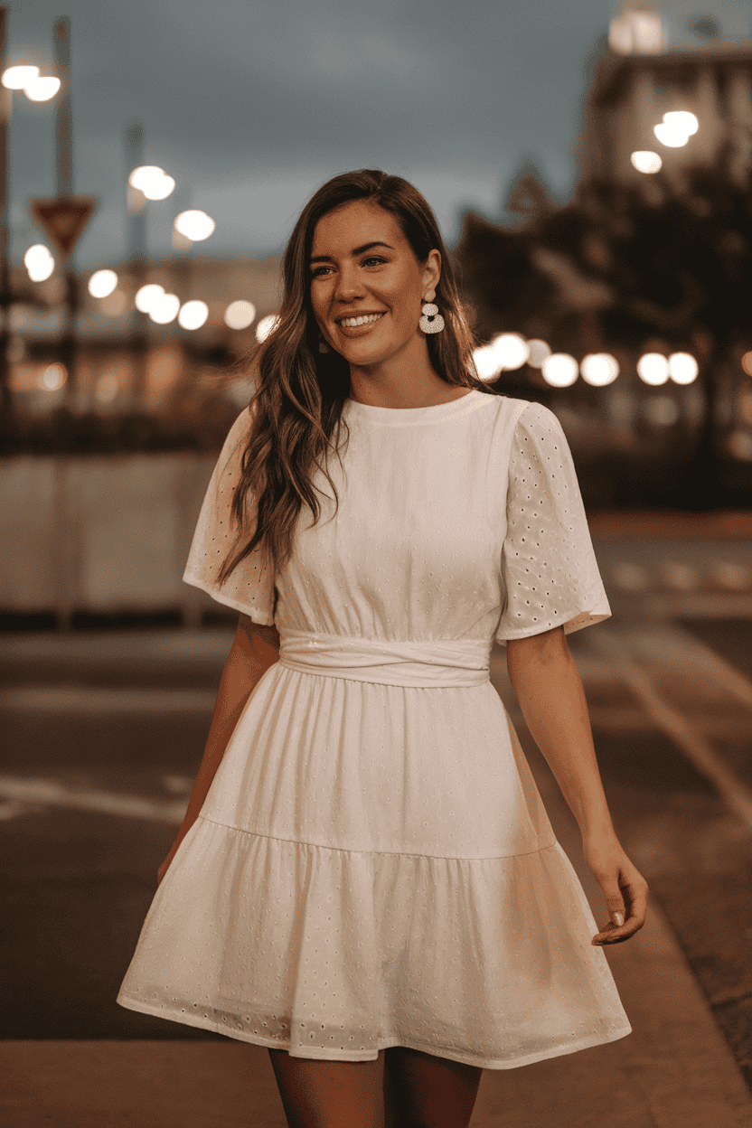 You can’t go wrong with a white tiered mini dress that wraps at the waist. It’s light, stylish, and gives you a nice shape.