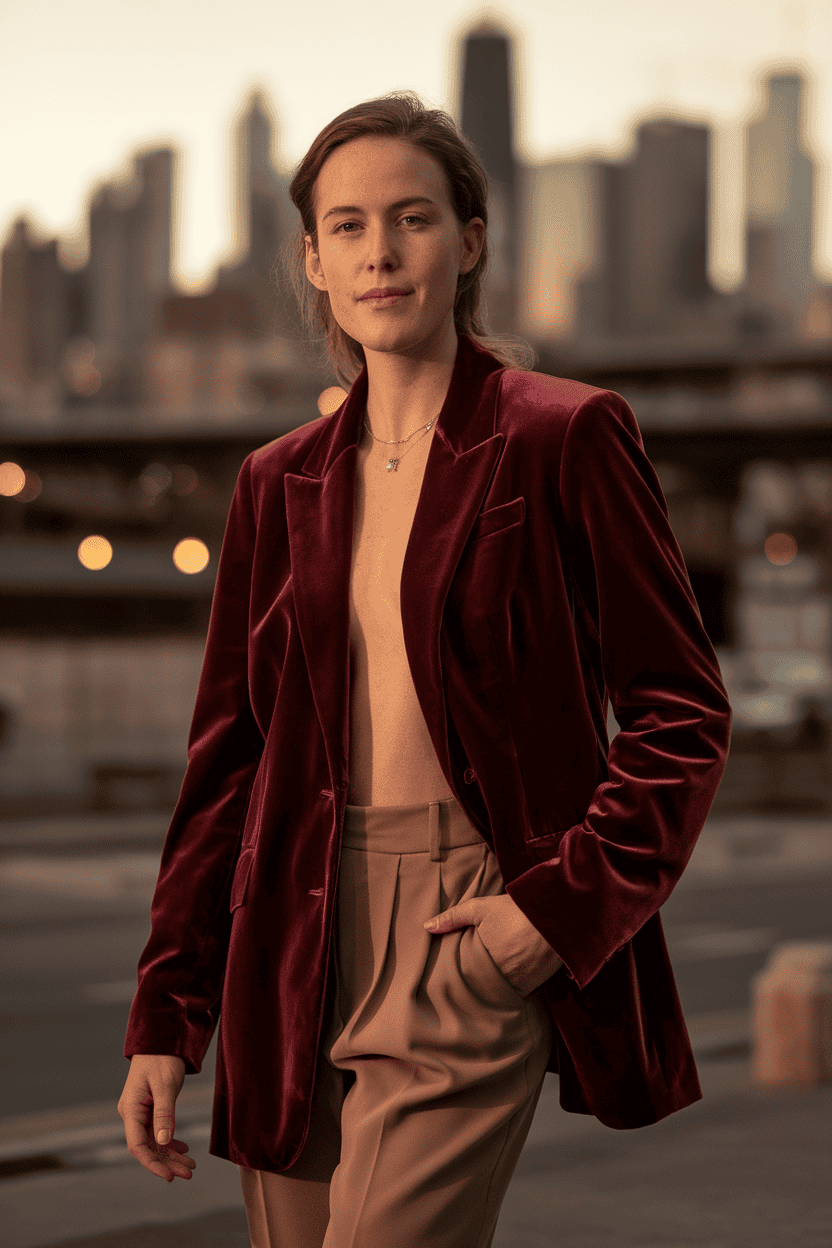 Pair a velvet blazer with tailored pants for a sharp look. The soft blazer contrasts nicely with crisp pants.