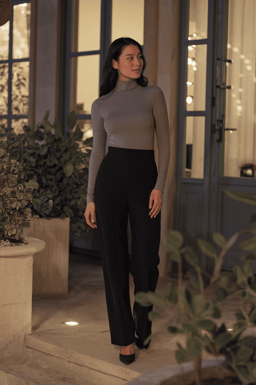 High-waisted cigarette pants and a simple turtleneck always work. This combo looks sleek and feels comfortable for a night at a jazz club.