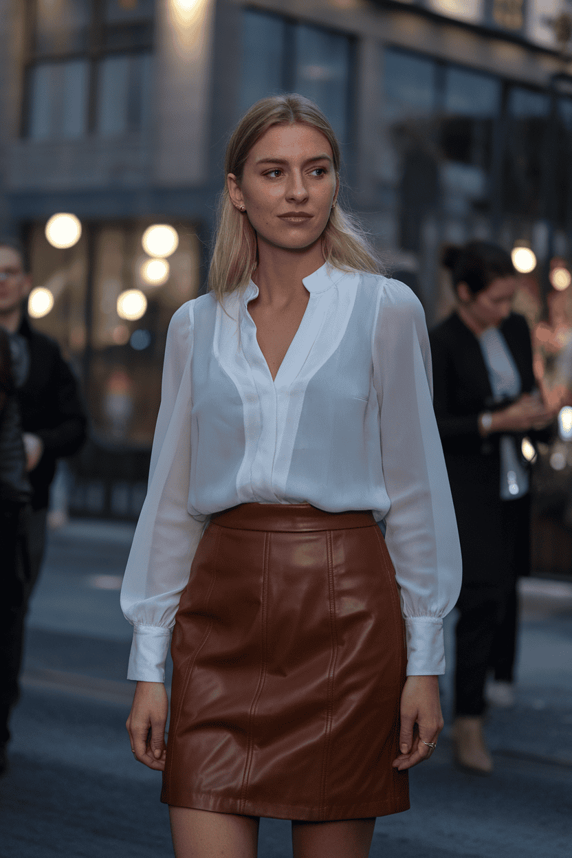 Try a leather skirt with a tucked-in chiffon blouse for the perfect mix of edge and softness. The flowy blouse balances the leather.