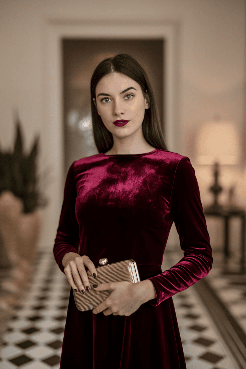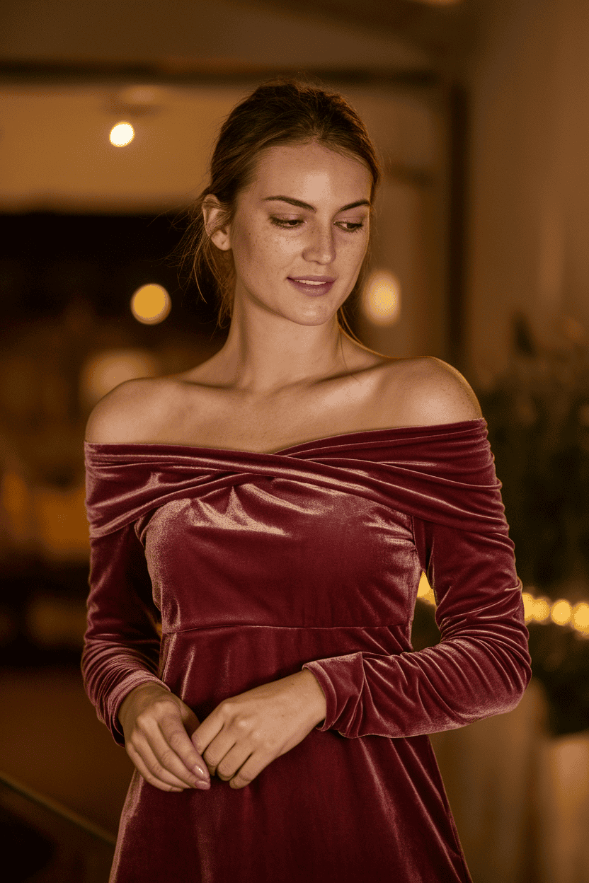 If you want to stand out, try an off-shoulder velvet dress. It’s got that soft, rich vibe without going overboard.