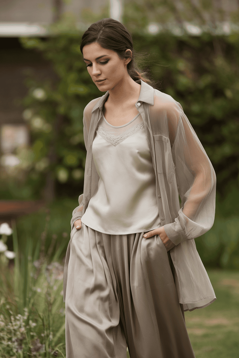 Pair it with palazzo pants for an easy, relaxed vibe. The wide legs balance out the light top and make the whole thing feel comfortable, yet put together.