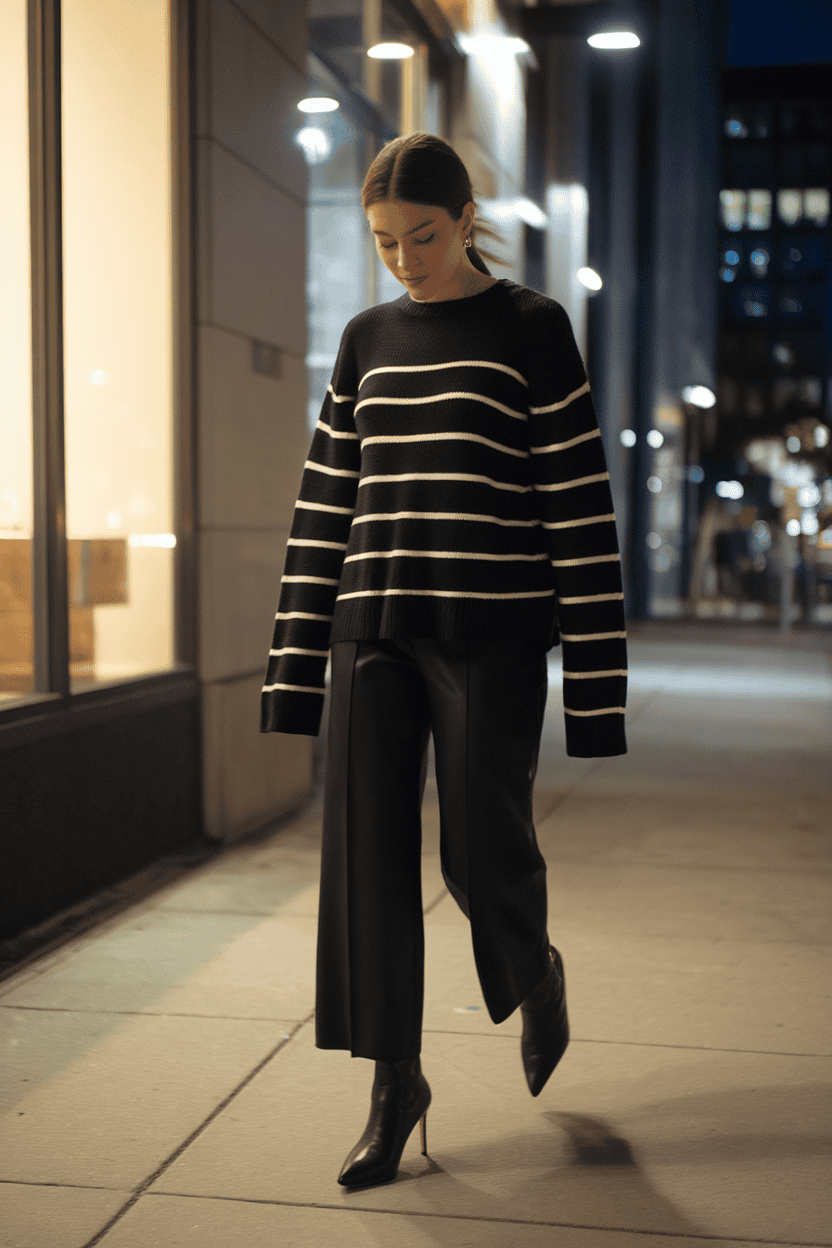 Go for neutral colors like black, navy, or gray. Simple heels or loafers keep it comfy but still chic—ideal for a night out at a jazz club.
