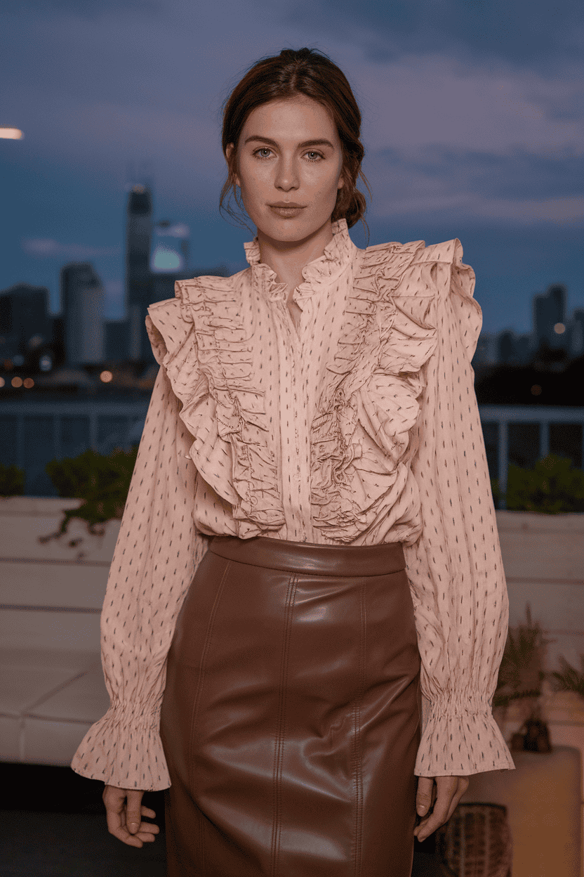 Mix things up with a ruffled blouse and a leather pencil skirt. The flowy top softens the edgy vibe of the leather.