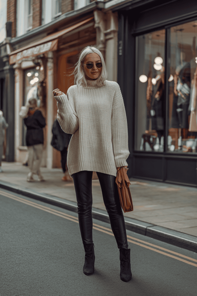 An oversized knit sweater with black leather leggings? Always a good move. The sweater keeps you cozy, and the leather leggings give things a sleek edge.