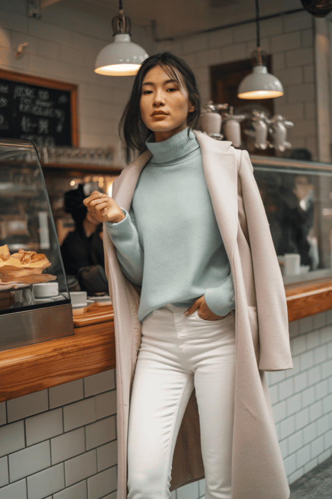 Honestly, a soft cashmere turtleneck in pastel blue just feels right for winter. It’s cozy and looks fresh.