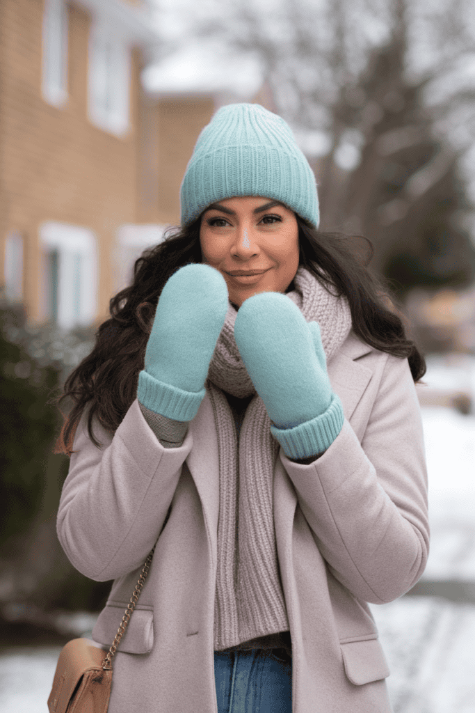 Icy pastel blue mittens are such a cute winter touch. They fit the snowy theme and keep your hands warm.