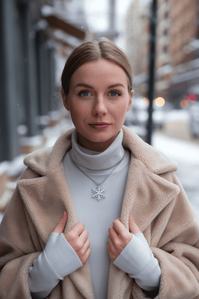 Crystal or opal snowflakes look good with casual or dressy outfits. I’d go for a silver chain to keep it versatile and easy to match with the rest of your winter wardrobe.