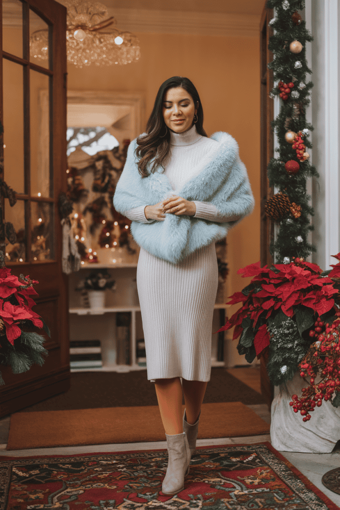 Add a little wow-factor with bold accessories like sparkly earrings, chunky scarves, or a faux fur collar. Silver or icy blue jewelry honestly just nails the winter vibe.